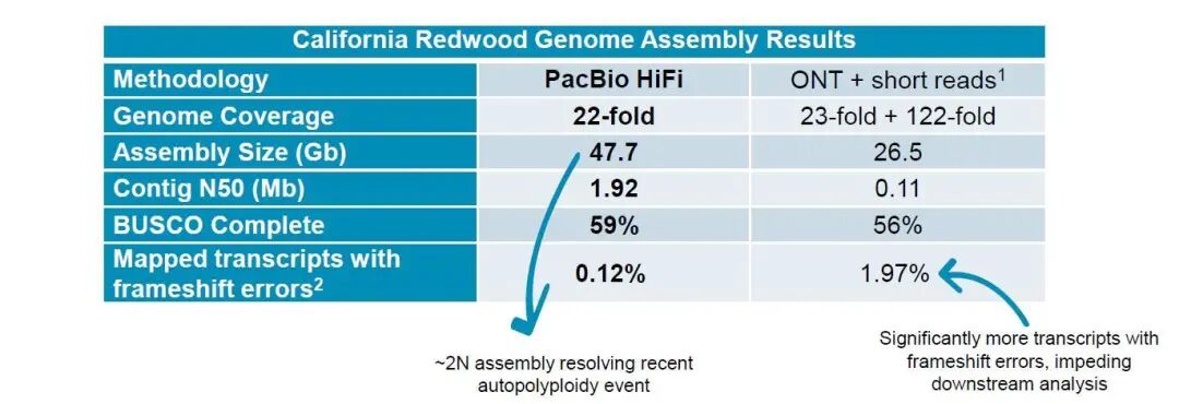 Michelle Vierra 博士 PacBio动植物科学部门战略营销经理 故事的开头还得从2019年1月份的PAG会议说起,在本次会议上PacBio首先展示了更新的HiFi read。区别于其他的测序模式和结果,不管是与PacBio自家的长片段测序技术(CLR),还是NGS技术的短读长测序模式对比,HiFi read兼顾了长读长(更大插入片段可达25Kb)和高精度(不低于99%的准确度)。这种测序结果可以说是又长又准,不仅很容易就可以跨过基因组中较短的复杂重复区域,同时高准确度结果又保证了较大区域内的复杂的重复基因序列的解析,使得对超大复杂基因组的测序组装变得不再是难事。 PacBio HiFi Reads的生成原理 点击图片了解更多HiFi reads相关内容 使用HiFi测序模式不仅已经完成了从人类基因组到大麻到鱼到四倍体月季等动植物的高质量组装,同时随着PacBio HiFi reads测序模式的成熟,更多的生信工具如HiCanu, Hifiasm, Nighthawk同样也针对HiFi数据做出了优化适配,使得使用PacBio HiFi数据进行复杂基因组的组装变得更加的简单。 在PAG 2020中首次亮相的针对HiFi数据优化的三个assemblers/phasing工具 ——HiCanu, Hifiasm, Nighthawk 但宣传毕竟就是宣传,有人就问了,你宣传的这么好,那你组装个超大基因组看看啊,比如17Gb大小的六倍体小麦基因组试试?当时Michelle Vierra内心应该是很慌的,毕竟没这么玩过啊,但得知已经有人在12个小时就完成了11GB的燕麦基因组的组装,并且contig N50的大小超过了20M之后,我们的Michelle Vierra博士秉承着美国人Go Big or go Home的勇于拼搏的精神,决定了那干脆干票大的,也别17Gb了,直接上27Gb的加州红杉的基因组组装吧! 加州红杉,又名 加州紅木(Coast Redwood,California redwood,Sequoia sempervirens) 红杉是世界上生长更快的针叶树之一,它们已经存活了数千年。曾经遍布整个北半球,现在只剩下5%的原始海岸红杉林。 说干就干,科学研究容不得丝毫的懈怠!Michelle 和她的同事朋友们在一个阳光明媚的周一下午就直奔风景优美的斯坦福大学校园,开始采集加州红杉的样本,并在公司同事帮助下分离获得了加州红杉的DNA。回到实验室后就立刻着手样本的DNA提取与文库构建工作。 加州红杉的样本收集和处理过程 使用BluePippin将DNA片段选择大小设置为15 kb,更长的插入片段允许HiFi读长达到50 kb。经过后续分析我们发现: 高达50 kb的HiFi reads精度都可以高于Q20(99%) 而且大部分HiFi reads准确度都接近Q30(99.9%)。 HiFi reads 读长分布 Insert Size HiFi reads 的准确率分布,上图表示reads计数(Bin counts)在准确率和读长上的分布。可以看到: 所!有!的!reads准确率都在Q20以上! HiFi reads更密集的插入片段在20k-30k这个区间! 更长的插入片段可以达到50k 大约有超过一半的reads准确率接近或超过Q30。 这就是可用于高准确度基因组组装的高质量长读长HiFi reads! 接下来的工作就是进行测序与组装了,经过一周时间的PacBio SMRT测序技术测序,总共获得了606Gb的HiFi数据,相当于加州红杉27Gb的基因组序列的22X覆盖深度。从以往的经验看使用HiFi测序模式只需要20X左右的测序深度就足以完成高质量的基因组组装。那么接下来就是开始这个超大基因组的组装工作了。 随后PacBio的资深生信科学家Greg Concepcion博士选择了被报道为更快的且专注于解析单倍型的组装软件---Hifiasm,开始了这个27Gb的基因组组装工作。 在Hifiasm软件上仅仅运行了6天之后,这个庞然大基因组的组装工作就顺利完成了!而这6天所用到的计算机资源也不过是: 服务器配置:64核512Gb RAM 生成HiFi数据:46,000 CPU hours 基因组组装:7,200 CPU hours 短短6天的分析时间,获得的结果也依然是相当惊人的!结果几乎是预期基因组大小的两倍,其中Contig N50达到了1.92 Mb! 组装获得的大于预期的基因组大小,大部分都为两个类似的单倍型,而并非单纯相异的六倍体,这与Scott等人所报道的加州红杉的研究类似,印证了加州红杉的多倍体化是自多倍体事件。 加州红杉基因组组装结果及不同测序平台结果的比较 也许您会对上面的加州红杉组装结果中BUSCO评分只有59%感到迷惑,不是一般较好的组装结果BUSCO值都要高达90%以上吗?这是因为裸子植物(加州红杉属于裸子植物)的BUSCO基因集与被子植物的BUSCO基因集相差很多。这意味着针对加州红杉使用通用的BUSCO基因集来评估基因组完整性是不准确的,只是目前我们还没有其它更好的评估方法。 回顾一下整个过程,从对加州红杉基因组的研究中可以得到了什么结论呢? 首先,任何生物体都可以使用HiFi数据获得高质量的基因组信息。本次加州红杉的基因组达到了高质量基因组组装连续性、完整性和准确性(Contiguity, Completeness,Correctness)的全部3C标准。 其次,高质量的基因组组装不再消耗大量的测序与组装时间。短短17天内从提DNA到测序组装一个27 Gb超大全基因组序列,这已然改变了业内对大型复杂基因组组装的看法,以前人们认为组装需要大量时间和计算资源,更不用说测序时间了。这个庞大的基因组项目经历了4天的样品准备,7天的测序,仅仅只花了6天的时间进行组装,总共不过短短17天时间。因此可以说,任何想要组装高质量基因组的计划都可以通过HiFi reads来实现。 对比友商测序技术 回过头来看,其他的测序技术是什么样的结果呢?请看下图,我们来对比友商总体情况~ PacBio与友商在此次加州红杉基因组项目时间上的对比 PacBio的几乎2周相对于友商技术的接近2年 PacBio组装结果几乎是预期基因组大小的两