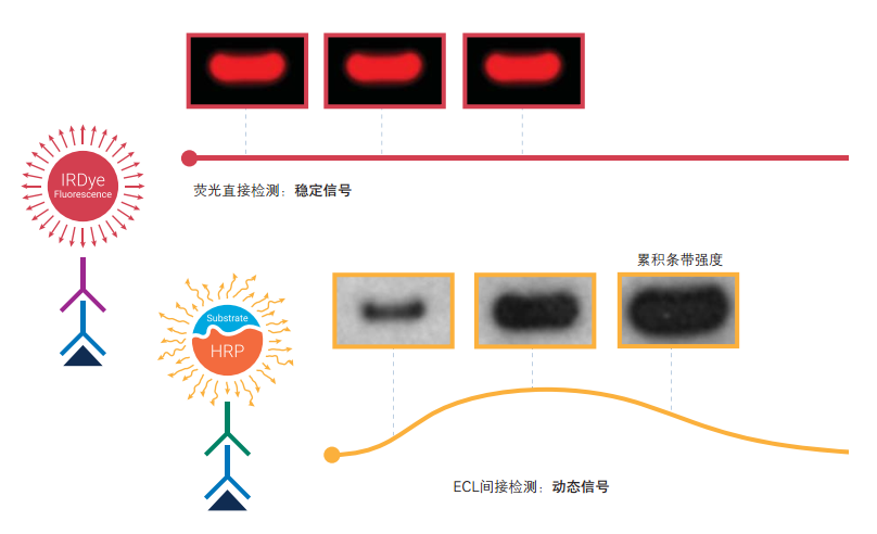减少变量,提供重复性 Odyssey®双色红外激光成像系统采用近红外荧光成像技术,产生稳定的近红外荧光信号,与传统的化学发光相比,信号不受曝光时间、温度等影响,信号与目标蛋白丰度成很好的线性比例关系,因此定量更准确、重复性更高,并且近红外荧光Western Blot膜还可以长期保存好几年。