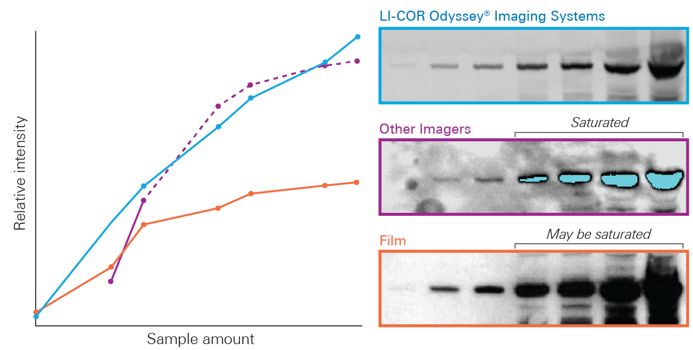 采集更准确的定量数据 采集弱信号的同时避免强信号饱和 关于线性范围,期刊杂志是这样规定的: Western Blot实验数据在线性范围内意味着:检测仪检测到的信号强度和蛋白丰度是成线性比例关系的,线性范围内检测到的数据意味着定量数据。 Odyssey®双色红外激光成像系统 具有更宽广的动态范围(6+Logs),单次采集就可以捕获线性范围内的所有实验数据,采集弱信号的同时强信号不饱和,帮助您获得符合期刊杂志发表要求的定量Western Blot数据。