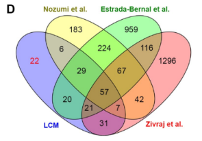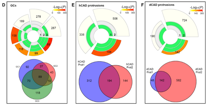 首先,各位看官,咱们先了解今天要“受刑”的这位CAD细胞,该细胞拥有原代神经元的特征,是神经元分化研究的独特工具。CAD的分化能够通过无血清饥饿培养诱导(dCAD),产生容易识别的细胞突起;加入过氧化氢处理的CAD(hCAD),能够增加丝状伪足和TNT、GCs的数量。为了获得足量的蛋白,作者利用LCM从5000~6000次切割中收集hCAD的GC样本,从~1000次切割中收集hCAD的丝状伪足样本,从~1000-2000次切割中收集dCAD的突起样本(轴突和树突),从~12000次切割中收集hCAD的TNT样本,并收集3ug的全细胞作为对照。上图~~~ LCM切割dCAD(20X)。I. 切割前的圈选,II.激光显微切割过程产生的极细切割线 III.切割后的轴突和树突。轴突上箭头处为丝状伪足。 LCM切割hCAD(40X)中各类细胞突起 LCM切割hCAD(40X)中生长锥结构(GCs) LCM切割hCAD(40X)中丝状伪足 LCM切割hCAD(60X)中隧道纳米管(TNTs) 将采集的dCAD突起和hCAD突起各自分成两组,GCs分成3组,TNTs一组,经质谱检测,每组均鉴定到几百个unique protein。其中,dCAD突起、hCAD突起和GCs在两组中共同鉴定到的Unique protein都超过一百个。 接下来,作者对结果的准确性及重复性进行一系列验证实验。 首先,作者使用SuperExactTest软件评估对照组(全细胞)和三组特异突起的unique protein的交集度和相关性。结果显示每组细胞突起都表现出高度的蛋白重叠,且对照组和检测组高度相关,说明LCM分离的微量细胞突起样本能够满足数据的准确度和重复性要求。