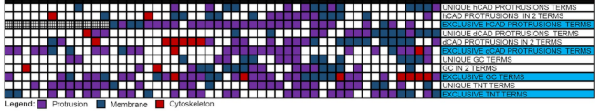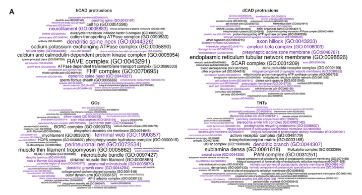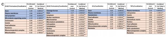同时,利用免疫荧光(IF)确定LCM/MS鉴定到的蛋白是否真实存在。从已知功能和定位信息的蛋白中,挑选四个被期望出现在细胞突起的蛋白(Cd47, Anxa2, Tenm2,Cobl)和4个不被期望出现的蛋白(Grk5,Hist1h3b, Hspa1b, Arg1)。IF结果显示四个被认为应当出现在细胞突起的蛋白均在不同的突起物中被鉴定到。而四个LCM/MS鉴定出的但形态学尚未证实的蛋白,也分别在更初分离的突起物中被IF观察到明亮的斑点信号。总之,此8个LCM/MS鉴定到的蛋白,均在不同的突起中被IF实验检测到存在,证实了该方法的准确性。 当作者采用subtractive的方法重新分析采集的数据时, GO注释的结果显示使用LCM/MS从8个样品鉴定到的每组unique protein的前50个注释多数都与细胞突起的功能、定位高度相关,也说明该方法的准确性和特异性。