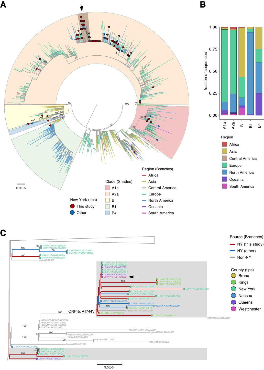 位于纽约市的西奈山医院,是纽约市更大的学术医疗体系。近日,由西奈山伊坎医学院(ISMMS)的研究人员牵头,采用PacBio SMRT测序技术,通过对84个病人的90个SARS-CoV-2病毒样本进行分子流行病学分析,确认纽约市早期确诊的COVID-19病例主要来自欧洲地区。这一研究也是个追踪这些病例来源的研究,并表明纽约市的流行病毒主要来自于美国与欧洲之间的无追踪传播而引起的。目前有限的证据还无法支持病毒从中国或亚洲地区直接传入。并且,也追踪到了病毒早期的在纽约发生的社群传播。近日,这篇文章已经发表在了预印网站medRxiv上。 冠状病毒基因组为线性单股正链的RNA病毒。相对于DNA病毒,RNA病毒往往具有更频繁的变异。如何区分整个基因组中可能只有少数SNV不同的变体来进行深入研究?必然需要依赖于更准确的基因组碱基序列信息。而在满足高精度要求的同时,只有PacBio SMRT测序技术能提供的更长读长范围。 HiFi Reads生成原理示意图 目前在新型冠状病毒更大的数据库GISAID上,已经分享了来自不同国家运用各种测序技术的新冠病毒基因组组装结果。然而,通过比较,可以发现,相当一部分的结果连续性较差,并且基因组中依然还有大量未知的区域存在。可想而知相关的分析也会受到限制。 从组装的连续性,以及未知序列的大小上看,GISAID上相当一部分SARS-CoV-2的组装结果很差。 不过,更新的数据表明,来自PacBio测序技术的结果,能够很好的呈现出准确而连续的病毒基因组组装结果。 借助PacBio长读长测序技术,采用长扩增子的策略,避免了由短扩增子引起的病毒基因组中容易出现的gap,从而可以获得更加完整的病毒基因组。 在本文中,作者所采用的技术策略为,首先对样本中RNA进行随机反转cDNA,随后通过重叠范围在200bp的瓦片叠加的引物对SARS-CoV-2的全基因组进行扩增,生成带有barcode信息的1.5-2 kb扩增子。在后续的SMRTbell文库构建环节,连接Overhang SMRTbell adapters形成文库后,在Sequel系统上进行测序。 后续,通过CCS read方式,获得质量在Q20(with>3 passes)以上的序列进行参考基因组比对,更终获得高准确度的不同病毒样本的全基因组组装结果。随后通过SNP进行进化树分析。 作者对来自3月18日前确诊的84个病例中,不同临床取样的90个SARS-CoV2病毒样本进行进行全基因组测序,生成了72个完整的全基因组以及18个部分(>95%)的基因组序列。通过系统进化树进行系统分析,发现早期纽约市流行的SARS-CoV-2有87%是来自于A2a 分支,而这一分支有72%的病例主要来自欧洲。因此也就说明了纽约市在早期流行的病毒主要来自于美国与欧洲之间的无追踪传播。此外,结合流行病学调查,基因组分析的结果也显示了在2020年3月18日之前,SARS-CoV2在纽约市的社区传播。 通过病毒全基因组的高质量测序结果,可以对病原体进行精确监控,从而使研究人员可以推断出病原体进入社区的来源和时间。结合目前共享的成千上万的SARS-CoV-2序列,以及西奈山伊坎医学院开展的病原体监测计划,可及时生成在西奈山卫生系统中寻求治疗的众多不同患者群体中病原体的高分辨率遗传信息。并将这些数据整合到临床操作中,以支持研究和临床护理。 在这篇文章中,作者分享了有关SARS-CoV-2全基因组扩增的有关引物序列,供全世界进行此次疫情相关研究的科学家们参考。另外,近期PacBio官方分享了有关使用PacBio进行COVID-19研究的相关信息。更多COVID-19相关信息请访问我们的COVID-19 Sequencing Resource Center(见文末链接),以查看更新的测序方案,引物信息和相关文献。 点击下方连接,了解更多有关PacBio在病毒方面的应用研究内容 - SMRT测序技术应用于COVID-19相关研究的共享资源 - 在对抗COVID-19大流行的战斗中,科学家们转向了PacBio测序 - 量化流感病毒的多样性和在人群中的传播——从Nature Genetics文章看病毒研究 - 新型冠状病毒应该如何通过SMRT 测序做进一步深入研究? - 不明原因的病毒? 参考文献: Introductions and early spread of SARS-CoV-2 in the New York City area . medRxiv 2020.04.08.20056929; doi: https://doi.org/10.1101/2020.04.08.20056929 PacBio Webinar 预告 Opportunities for using PacBio Meredith Ashby, Ph.D. Director, Market Strategy for Cancer & Microbial Genomics, PacBio 4月23日 星期四 10:00 AM (北京时间) 长按并识别右边的二维码 访问链接,注册参与 基因有限公司作为PacBio公司在中国区的独家代理商,自2011年以来将PacBio第三代单分子实时测序技术引入国内,一直为国内用户提供专业的三代测序系统的安装培训,技术支持,应用培训与售后维护工作,赢得客户的一致好评与信任。基因有限公司将一如既往的支持越来越多的PacBio用户。
