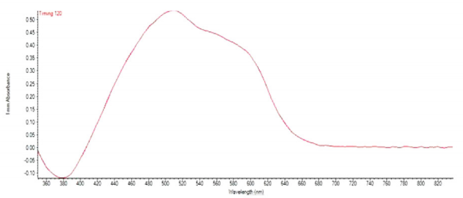 该实验首先使用NanoDrop One/OneC创建一个自定义方法,对待测物进行全光谱扫描。实验测量范围设置为可见光范围(350–840 nm),如下图1所示,发现在490 nm处出现吸收光峰值。根据甲瓒吸收光谱,在750 nm处作为基线从而校正参数。