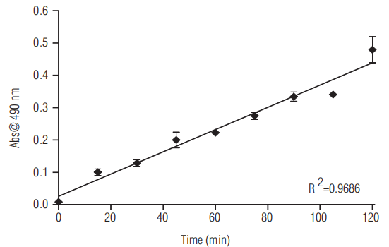 为了确定最佳检测时间,监测HepG2细胞中MTS还原为甲瓒的速率。将HepG2细胞接种到96孔板中,培养48小时后进行MTS分析,使用NanoDrop One/OneC分光光度计测量490 nm处的吸光度值。结果如图2显示,HepG2细胞中的脱氢酶正在有效地将MTS还原为甲瓒,吸光度值随时间而增加。