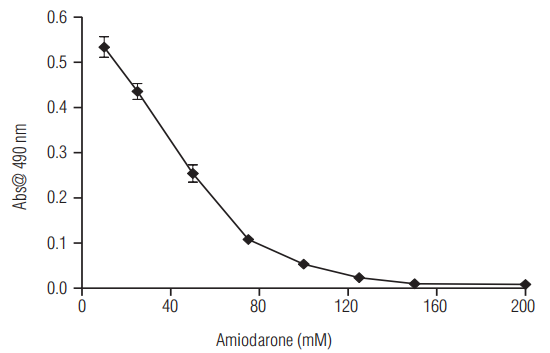实验还检测了胺碘酮对HepG2细胞活力的影响。将HepG2细胞接种于96孔板中,培养24小时。用不同浓度的胺碘酮处理细胞培养24小时,使用NanoDrop One/OneC分光光度计测量490 nm处的吸光度,MTS分析如图3所示。