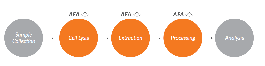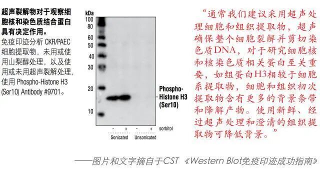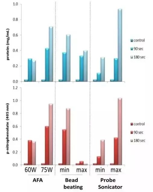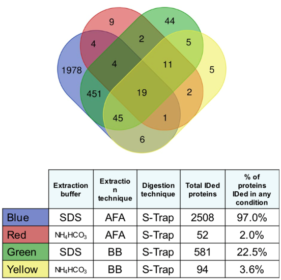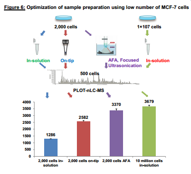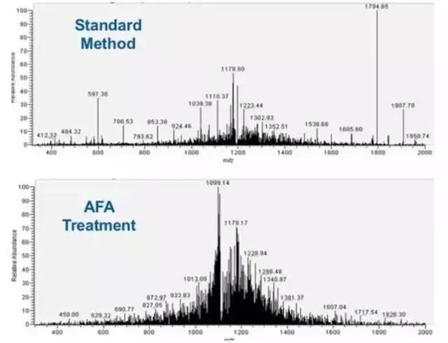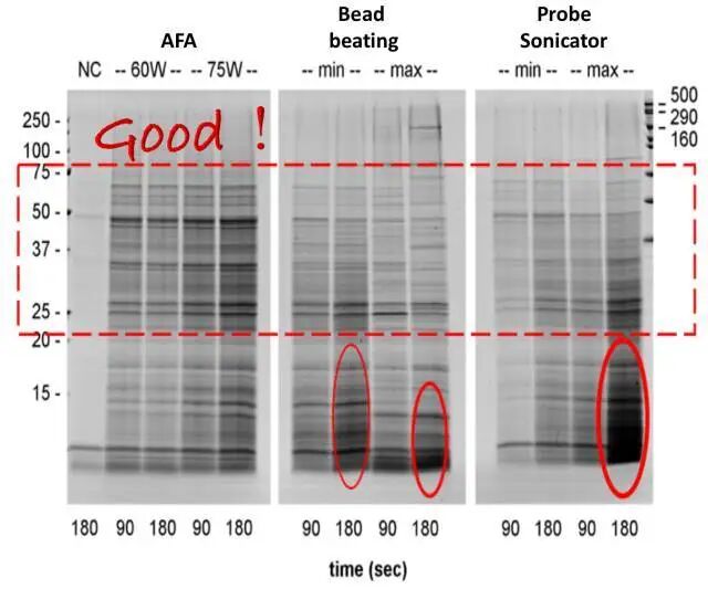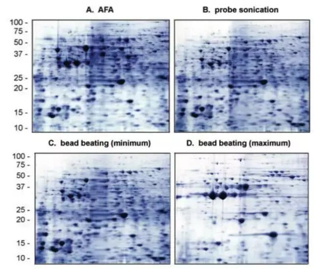 但是尝试传统水浴超声或者是探头超声的同学们可能还是遇到了超声后蛋白出现降解的情况,是什么原因导致的呢?从下图Covaris AFA与常见破碎方式在处理样本时的温度变化比较中我们可以看出,与传统的水浴超声和探头超声相比,达到同样的破碎效力,Covaris AFA产热更低,耗时更少。而传统超声如水浴超声当剪切力到达2MPa,处理600s时,样本管温度由原来的4℃升高到25℃。这个不易察觉的温度升高,往往造成了蛋白的降解。 Covaris AFA样本处理系统。与所有传统的基于超声的样本处理方法不同,Covaris采用聚焦超声技术(AFA),仪器与样本不进行直接接触,球型换能器产生超声聚焦作用于样本,能量利用率极高,方向和力度精准可控,处理重复性好。仪器功率低,效率高,整个系统无过多热能产生,温度不易失控。 AFA助力样本制备 1. AFA 提取保留蛋白完整性提高蛋白得率 许多已发表文章都认可了AFA技术提取能提高蛋白得率,并且帮助蛋白质保持在自然状态,保留蛋白完整性。这对于研究翻译后修饰(PTMS),如磷酸化、泛素化或蛋白活性测定非常有帮助。 来看个实例。分别使用Covaris AFA聚焦超声法、珠子研磨法和探头超声法,对酵母菌液进行破碎裂解,每种方法均使用两种功率。对三种方法提取得到的蛋白样品进行浓度、磷酸酶活性,SDS-PAGE分析。 Fig.1 使用自适性聚焦超声(AFA)、珠子研磨、探头超声分别裂解酵母菌液,总蛋白得率(上)和磷酸酶活性(下)。 对上述三种方法提取的总蛋白样品进行SDS-PAGE分析,结果如下图所示: Fig.2 自适性聚焦超声(AFA)、珠子研磨、探头超声分别裂解酵母菌液,得到的总蛋白SDS-PAGE结果。 从图2中可以看出,AFA 处理的酵母细胞提取的总蛋白中25~75 kD之间的高分子量蛋白丰度明显高于珠子研磨法及探头超声处理的样本,同时25kD 以下的低分子量蛋白峰度明显低于另外两种方法处理的样本。值得注意的是,虽然探头超声MAX 处理条件下的总蛋白得率及磷酸酶活性与AFA 处理结果相当,但是通过SDS-PAGE 结果我们不难发现,探头超声MAX 处理条件造成了严重的蛋白质降解,这种样品将严重影响后续的western blot、双向电泳以及蛋白质谱的结果以及分析的准确性。 将上述样品进行双向电泳分析,结果如下图所示: Fig.3 自动聚焦超声(AFA)、探头超声、珠子研磨(minimum&maximum speed)裂解酵母菌液,得到的蛋白样品,使用2-DE双向电泳分析。 2-DE结果显示使用AFA处理的蛋白样本中保留了更多高分子量蛋白。 因此,Covaris自适性聚焦超声(AFA)技术应用于蛋白提取,提高总蛋白的得率和活性,保护高分子量蛋白的结构完整性,保留蛋白质的泛素化、磷酸化等修饰位点。 2. AFA可以进行低起始量提取 在蛋白质研究当中,常遇到低起始量(细胞数<10,000))。AFA提供的精确可控聚焦声波技术提高了细胞裂解效率,帮助高效从低起始量样本中提取蛋白质、RNA、DNA、代谢物或其他目的产物。 使用Covaris AFA聚焦超声技术对重悬于15ul 25mM 碳酸氢铵溶液中的2000个细胞进行裂解处理,并与常规方法使用8M尿素进行普通超声后得到的蛋白质谱结果进行比较(上样量等同于500个细胞,结果如下)。 Fig.4 2000个细胞分别用In-solution、On-tip、AFA技术和10^7个细胞使用常规裂解方法提取获得的匀浆产物,上样其中500个细胞的蛋白产物进行PLOT-LC-MS串联质谱鉴定的结果(n=3),细胞为MCF-7细胞。 从上图中可以看出,AFA方法处理2000个细胞所得的蛋白质种类远远高于其他两种常规方法,同时经AFA处理后,在不使用变性剂的情况下AFA技术的处理可以有效的进行样品破碎,即使2000个细胞所得的蛋白质种类与常规裂解方法处理1X10^7个细胞所得蛋白质种类相当。此外,使用Covaris AFA聚焦超声技术处理的细胞可以在一管内完成还原、烷基化及酶解,所得肽段溶液可以直接进行质谱上样,无需脱盐处理,减少样品损失的同时大大缩短实验时间。 4. AFA提取蛋白种类更多更丰富 Fig.5 标准方法和Covaris AFA技术分别用于LC-MS前的胰蛋白酶消化,质谱结果展示 结果显示,在质谱前的蛋白样本消化过程中使用Covaris AFA技术,质谱分析出的肽段的种类(横坐标)和丰度(纵坐标)完胜常规方法。 5.从FFPE样品中提取蛋白质 FFPE样本是临床样本的最大来源之一。传统上,由于低效、不完全的石蜡去除和解交联,FFPE样本一直存在蛋白质回收效率差、重复性差、速度慢等问题。Covaris AFA技术和Protifi™s-™的独特组合可在单管单柱中快速简便高效的提取FFPE样本蛋白质,提高蛋白质得率和获得的蛋白质种类数,同时具有高度可重复性,无需有毒有机溶剂,此外也易于高通量扩展。 Fig.6 SDS/AFA/S-Trap workflow for FFPE samples Fig.7 AFA+5%SDS+Protifi S-Trap蛋白提取方法与研磨珠提取得到的蛋白质种类比较,样本为肾脏FFPE样本。 从上图可以看出使用5%SDS +研磨珠+Protifi S-Trap提取肾脏FFPE样本得到581种蛋白,而采用AFA+5%SDS+Protifi S-Trap蛋白提取方法则鉴定出2508种蛋白,远远高于采用研磨珠的方法。 6. AFA可处理难裂解样本 AFA超声技术已被证明对多种样本的裂解是有效的:植物、细菌、酵母或肌肉等坚硬的哺乳动物组织已经成功地用聚焦超声处理过。 Covaris 为您提供完整优化的蛋白质提取解决方案 Covaris针对不同的下游实验,开发出不同的protein extraction buffer。无论是天然蛋白还是变性蛋白,从仪器到试剂给您一个完整优化的蛋白质提取方案。 Fig.8 Covaris蛋白提取buffer选择表 Covaris truXTRAC Proteins-Tissue Lysis Bu