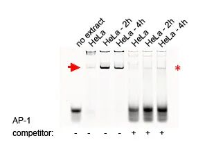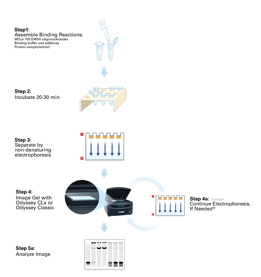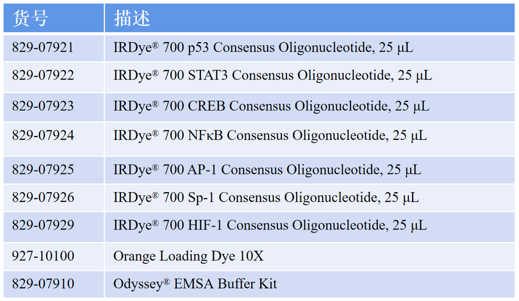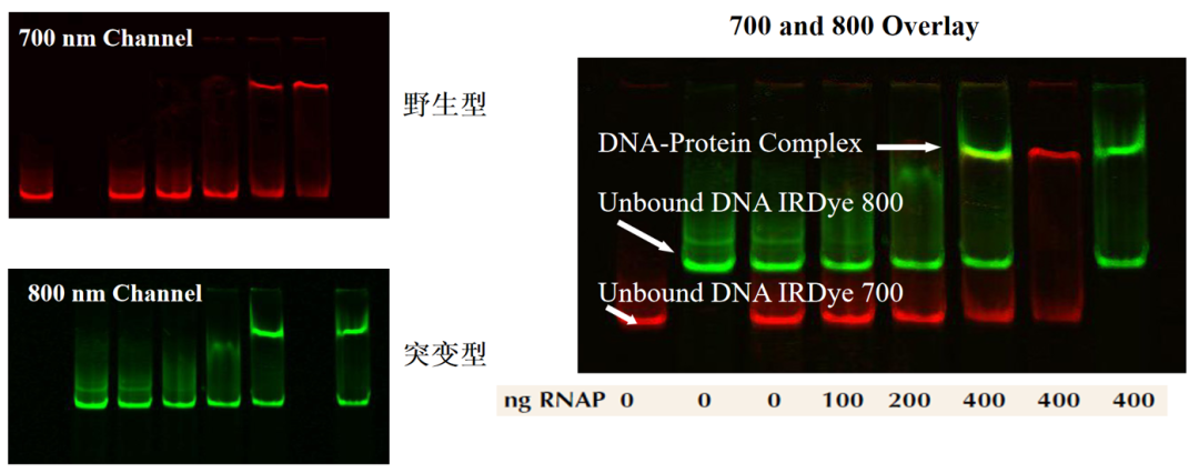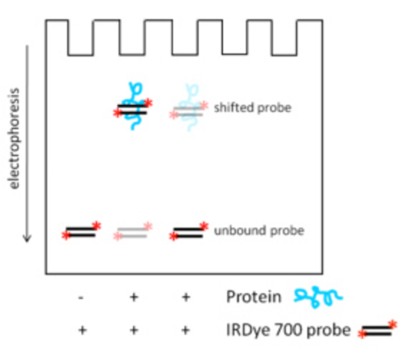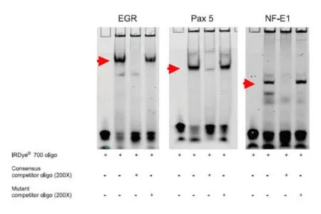 美国LI-COR公司开发的Odyssey双色近红外激光成像系统因检测背景更低、线性动态范围更广、可实现准确定量、重复性高、分析软件不改变原始数据且方便快捷、提供Western Blot完整解决方案而被Nature等期刊杂志推荐认可,它的应用很广泛,不仅仅用于WB成像,还可用于EMSA、In-Cell Western、In-Gel Western、Protein Array、Organ、Tissue Section、Protein Gel、DNA Gel等的成像。今天要隆重介绍的就是Odyssey双色近红外荧光技术在EMSA检测中的应用。 凝胶迁移或电泳迁移率实验(EMSA-electro-phoretic mobility shift assay)是一种研究DNA结合蛋白和其相关的DNA结合序列相互作用的技术,可用于定性和定量分析。这一技术最初用于研究DNA结合蛋白,也可以用于研究RNA结合蛋白和特定的RNA序列的相互作用。 传统的EMSA是用同位素标记DNA,通过显影的方式进行检测,这种方式步骤繁琐且会对环境和人体造成危害。用近红外荧光染料IRDye 代替同位素标记DNA片段进行EMSA实验,凝胶可直接在Odyssey双色近红外激光成像系统上成像,无需转膜,更方便、安全、快捷。