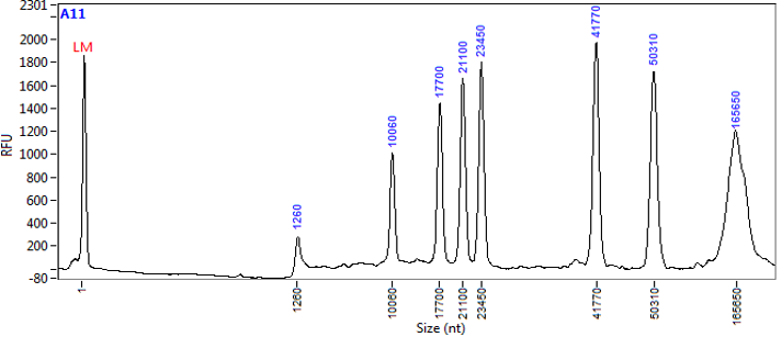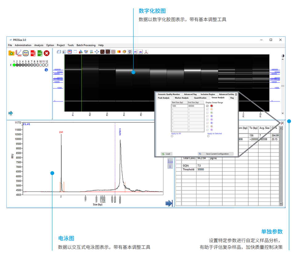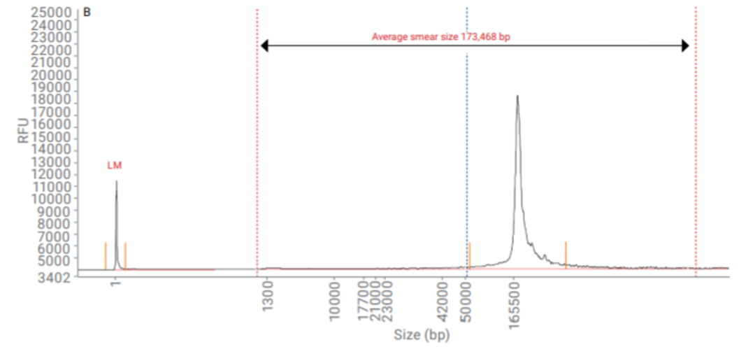 传统的脉冲场电泳多为手工操作,步骤繁琐且电泳耗时长。Agilent Femto Pulse自动化毛细管脉冲场电泳系统将毛细管电泳和脉冲场电泳结合在一起,利用平行毛细管以及通过交替转换电压正负极性来实现对大片段DNA的自动化、高通量、快速电泳和分析。 Femto Pulse不仅可以获得凝胶图、峰图,还可以实现用户自定义的快速结果分析。 Femto Pulse采用12道并行毛细管,12个泳道同时进行检测。可同时容纳3块96孔样品板,在无人值守的情况下,可一次性实现288个样品的分离。 传统脉冲场电泳其电泳时间一般为16-24h,而Femto Pulse仅需约1.5小时即可实现高达165kb的高分子量DNA的分离。 Femto Pulse可准确实现长达165kb的DNA的分离和分子量测定。 GQN(Genomic Quality Number) 可根据用户自定义条件对基因组DNA进行质量评估。如下图,该基因组DNA的平均smear大小为173648bp,GQN50kb为9.4,代表有94%的DNA片段分子量大于50kb(50kb为用户自定义条件)。 Fragment检测,上样DNA浓度低至50fg/μL。 Smear检测,上样DNA浓度低至5pg/μL。 基因有限公司作为Agilent自动化电泳产品线的中国区代理商,为您提供专业的产品咨询和技术支持。欲了解详情,请扫描下方二维码,将有技术人员一对一为你答疑解惑~