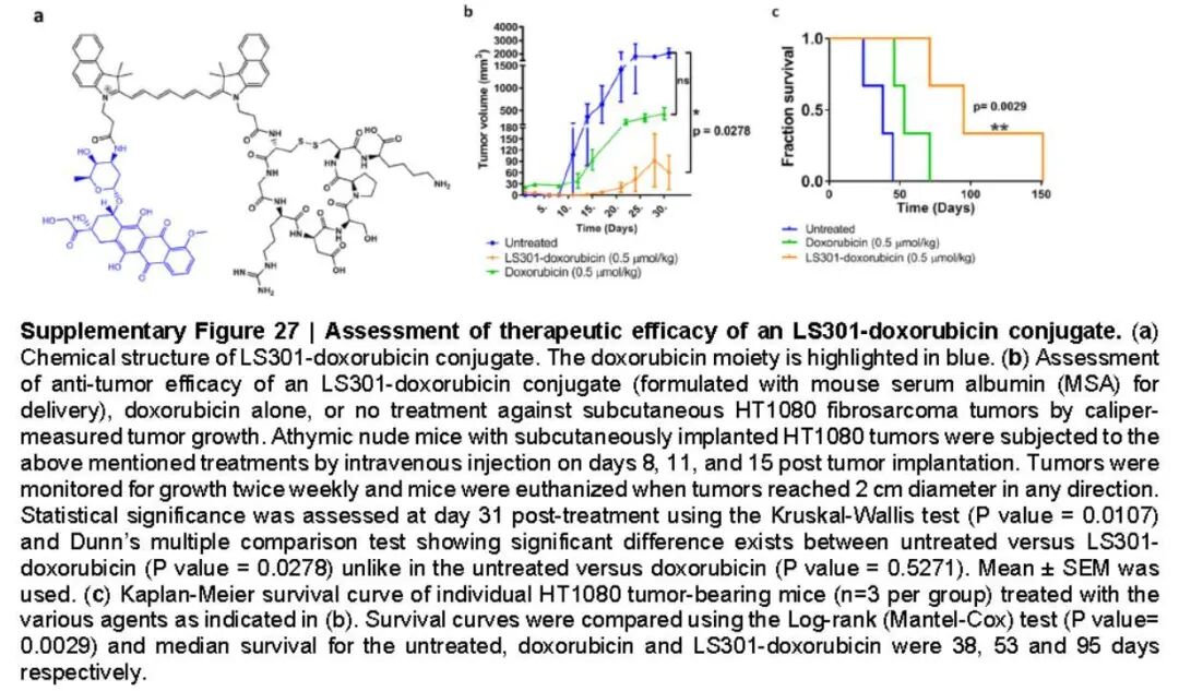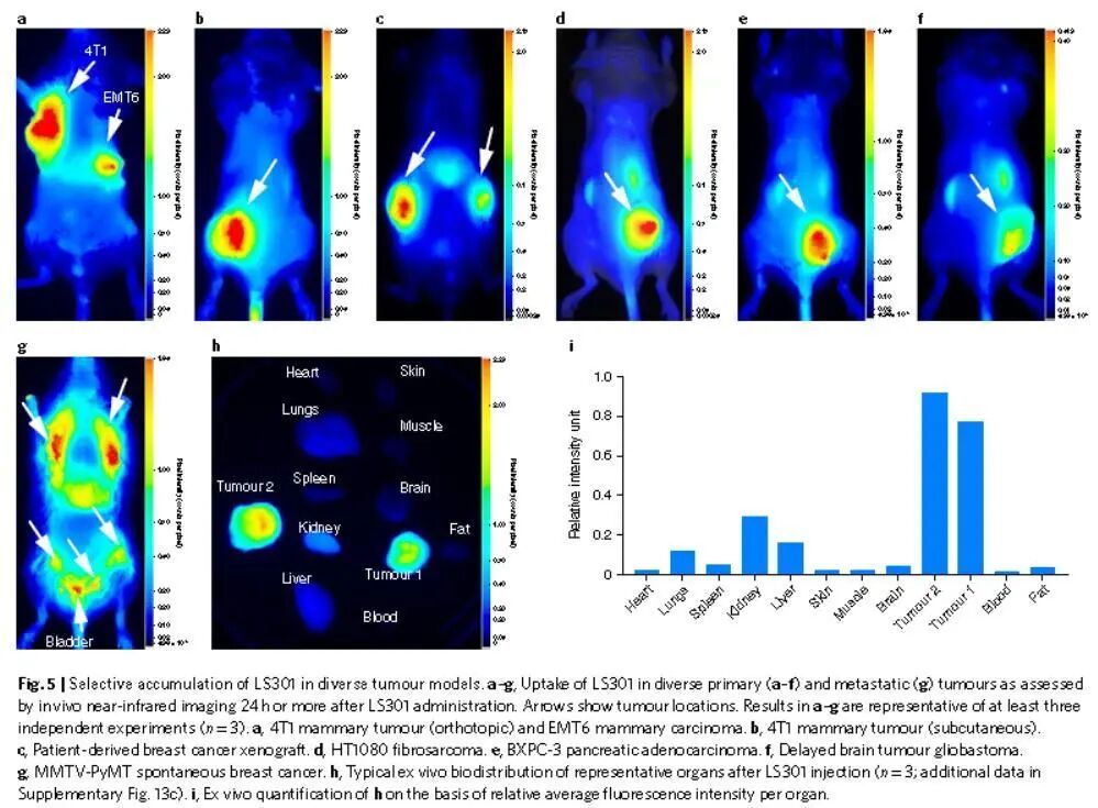 越来越多的靶向药物研究结果表明,近红外荧光染料备受欢迎。区别于传统的生物发光,近红外荧光染料对于实验结果重复性及定量准确性起着更好的辅助作用,能够更好地帮助实验人员获得可靠的实验结果。 2020年3月,Nature Biomedical Engineering杂志在线发表题为“Selective imaging of solid tumours via the calcium-dependent high-affinity binding of a cyclic octapeptide to phosphorylated Annexin A2”的文章,Duanwen Shen等研究人员利用一种近红外荧光染料标记的环八肽LS301与磷酸化的Annexin A2蛋白(pANXA2)选择性结合进行多种肿瘤模型的成像,实验表明这种小分子LS301可广泛用于肿瘤成像,并为药物靶向传递至肿瘤内部提供可能。 基于研究人员早期的研究,作者首先进行了新的小分子LS301的合成,结构如图1所示,包含近红外荧光染料Cypate及环状小分子肽段。 图1. LS301化学结构及组成 通过大量细胞水平实验及蛋白组学分析,作者发现LS301可以选择性结合pANXA2蛋白,其细胞摄取依赖于pANXA2的表达。而pANXA2在不同肿瘤模型中广泛表达,且存在于肿瘤微环境中(TME),可作为肿瘤检测和药物传递的靶点。之后作者通过体外实验验证LS301在不同实体瘤模型中的分布,如图2。使用裸鼠、Balb/c或C57BL/6小鼠单侧或双侧皮下注射105~107个肿瘤细胞,建立多种自发肿瘤模型。皮下注射生理盐水作为假性肿瘤对照。尾静脉注射LS301前后,使用 LI-COR Pearl Trilogy小动物活体成像仪在不同时间点进行近红外荧光成像及定量分析。实验结果表明在注射24h后,LS301可显著聚集于肿瘤部位,被肿瘤组织高度摄入,在肝脏及肾脏器官保留。 图2. LS301在不同实体瘤模型中的分布 此外,为了评估LS301作为小分子药物载体的传递效果,作者将阿霉素Doxorubicin偶联至Cypate染料的羧酸基团上,在HT1080小鼠肿瘤模型上进行肿瘤体积及生存时间测定,如图3。结果表明LS301偶联物可有效抑制肿瘤生长,延长小鼠生存时间。与游离的阿霉素不同,LS301不会在心脏内累积,因此避免了剂量限制的毒性。 图3. LS301-doxorubicin偶联物的治疗效果评估 文章的最后表示研究人员的工作为开发靶向pANXA2的临床药物提供了基础。尽管单克隆抗体仍然是靶向治疗的主要手段,但巨大的体积(约150 kDa)限制了其对肿瘤内部的渗透,而且高昂的生产成本也限制了其在少数临床中心的使用。小肽类药物,如LS301,可以廉价地大规模合成,代表了下一代优越的诊断和治疗方式。目前,作者正在努力评估小分子探针靶向pANXA2用于临床成像和药物给药应用的有效性,期望这些药物的成功开发扩大目前在癌症治疗中基于翻译后修饰(PTM)靶点的研究。 LI-COR Pearl Trilogy小动物活体成像仪具有动态范围宽、定量准确等特点,标配近红外荧光激光器可以提供更强的穿透力和更高的灵敏度,还可以提供符合临床认证的IRDye染料标记试剂盒,帮助研究人员更快更好的完成体外实验。 基因有限公司作为LI-COR近红外荧光成像系统中国区代理商,为您提供专业的近红外荧光成像解决方案、提供更多应用咨询及技术支持。欲进一步了解详细内容,请关注我们的官方微信“基因快讯”或联系您身边的基因有限公司工作人员。 欢迎扫描下方微信二维码与我们技术人员一对一在线联系