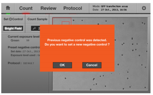 接下来我们看一下它是如何进行转染效率评估吧? 步骤一:样品制备、加样 先将10µL阳性样品加到芯片样品孔中。 步骤二:打开Luna FL电源、插入芯片 将芯片完全插入芯片槽,静置10sec-1min,确保细胞沉降下来,所有细胞不再移动。 步骤三:调节曝光强度 将阳性细胞样品加到样品孔中,选择 “GFP Transfection Assay” 选项,出现预览视野,预览为明场视野,在2x或4x下进行焦距调节;点击 “Bright Field” 切换到荧光GFP预览模式,调节曝光水平,哺乳动物细胞一般为18,可根据样品进行调节。 步骤四:设置阴性对照 插入阴性对照的样品,然后点击“Set-Control”,弹出下图对话框,点击OK,大约30sec时间,阴性对照分析结束,点击OK。 步骤五:检测GFP阳性细胞样品 插入 GFP-transfected 样品,点击 “Count Sample” ,大约30sec时间,样品检测结束,给出数据,如果想要继续检测样品,点击“Next Count”即可。 步骤六:结果查看、保存 点击“Image”,可查看明场、荧光场、是否Tag图片; 点击“Graph/Gating”查看细胞检测结果; 点击“Save/Print”进行结果保存,可保存PDF、图片、CSV多种格式的文件。 LUNA FL全自动细胞计数仪小结 Ø 具备明场和双荧光通道 Ø 激发光源:470±20nmLED,检测通道:525±20nm,600LP,适用于常见的细胞活性检测染料对,如AO/PI,FDA/PI等 Ø 更适合于PBMC、原代细胞、干细胞、酵母等组分复杂或者较小尺寸细胞的分析 Ø 可用于GFP转染效率的评估 Ø 自动液体透镜聚焦:操作简单、无磨损、响应快、聚焦稳定 Ø 大视野成像:数据更具统计学意义 Ø 去团化分析:计数更准确 Ø 机载计算机:无需外接电脑,节约空间 Ø 可重复使用玻片:节约使用成本 Ø 可输出:5MP图片、PDF、CSV数据 LUNA细胞计数仪荣获2019年金奖 在该严格的评级标准下,来自韩国Logos Biosystems公司的LUNA自动细胞计数仪获得SelectScience®质量奖章的金奖,在172位用户的评分中得到了平均4.7分的好成绩,受到了广大的科研工作者的一致好评,为您选择细胞计数仪提供有力的参考。 欲了解更多关于Logos Biosystems 自动细胞计数仪的信息,欢迎扫描下方微信二维码与我们技术人员一对一在线联系或联系您身边的基因有限公司员工,即日起可以申请免费试用哦!
