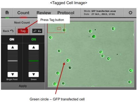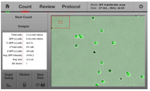Luna FL全自动细胞计数仪可简单、快速的进行GFP转染效率的评估。它整合了用于明场和荧光场检测的光学模块,将荧光显微技术与图像分析软件相结合,不仅支持台盼兰染色/非染色的明场计数,还支持荧光场如AO/PI染料的细胞计数和活性检测,酵母细胞的计数和活性检测,还可进行GFP转染效率的评估。