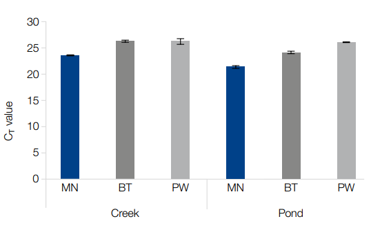 与传统的生态研究方法相比,以eDNA为研究对象对生态系统造成的损害要小很多且研究速度更快。然而仍存在许多问题。比如水样通常含有高浓度的污染物,可能会阻碍下游的分析;水样中提取的eDNA常常是片段化的,对净化提出了挑战;外源DNA的污染可能会引起分析结果的不准确性等。 如何从水样中纯化出满足下游应用的质量好的核酸? NucleoSpin®eDNA water MACHEREY-NAGEL 新推出的NucleoSpin® eDNA water试剂盒,快速纯化不同水样环境DNA (eDNA)。提取到的eDNA可适用于多种下游应用,比如metabarcoding、 barcoding 、qPCR 和 ddPCR。 01 流程 02 优势 1. 快速 70min内可实现filters上面的eDNA纯化,避免了常规提取过程中的长时或过夜孵育过程。 2. 适用于各种来源的水 流动水或静止水,淡水或咸水,清澈水或污染/浑浊水等均可适用。 3. 兼容多种过滤系统 可与多种过滤器和过滤系统兼容(不包括在试剂盒中),如传统的瓶口圆形过滤器(如45 mm)和筒式过滤器(如Sterivex™)。 4. 兼容实验室设置 如果实验室没有水过滤装置,该试剂盒还提供了一种直接水样沉淀eDNA方案,可有效快速分离游离DNA。 5. 降低外部DNA污染风险 该产品是在高卫生标准的控制和监测条件下生产的,并且试剂盒的组份已用环氧乙烷处理,以尽可能降低任何来源的DNA污染风险。 03 应用数据 优越的下游应用 使用NucleoSpin®eDNA water试剂盒和两个其它品牌试剂盒,分别对来自creek和pond水样进行eDNA纯化,并通过qPCR分析metazoan DNA。对于两种类型的样品,NucleoSpin®eDNA水试剂盒的使用效果显著更好(Ct值更低)。 淡水池塘中欧洲蟾蜍的季节性追踪 在德国,3月冬眠过后欧洲蟾蜍变得活跃起来,通常在四月开始产卵。对蟾蜍和/或卵和蝌蚪分离eDNA并进行后续PCR分析。在这里,使用了NucleoSpin®eDNA water试剂盒和NucleoSpin®过滤器Midi进行eDNA分离。PCR引物设计用于扩增特异性真核生物eDNA或一般真核生物eDNA。 04 技术沟通 咨询产品请扫描下方二维码,我们的技术人员会一对一与您沟通~