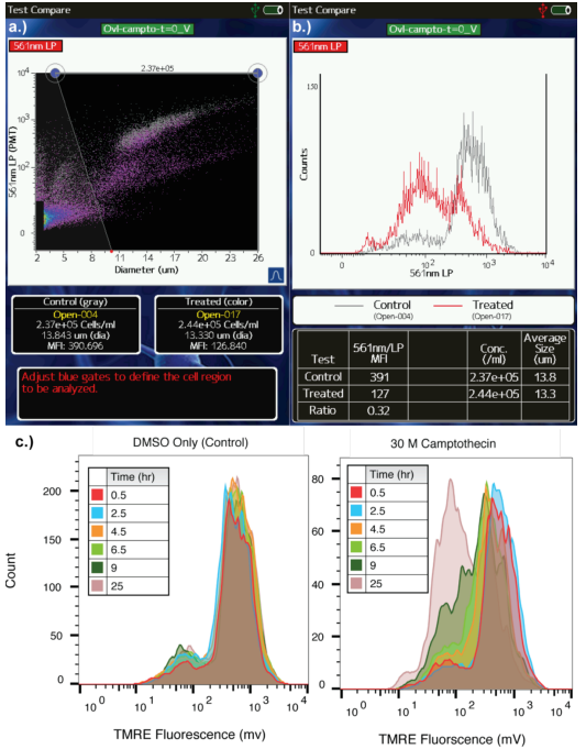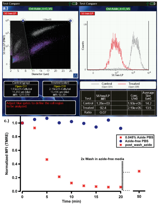 线粒体是细胞新陈代谢的主要细胞器,起着“能量工厂”的作用。线粒体内部通过一系列的氧化反应去氧化丙酮酸和NADH,以产生储存能量的ATP分子。而这一系列反应的驱动力是线粒体膜上电化学质子的梯度差,也叫做膜电位。由于这种质子的梯度差为磷酸化和氧化反应提供了“驱动力”,因此它也被当作一个衡量细胞的整体健康状态的指标,同时也可作为研究环境毒性对细胞新陈代谢影响的一个定量监测的指标。 那么该如何来监测线粒体的膜电位呢? 今天介绍一个简单的方法,即Moxi GO II新一代流式细胞分析仪结合TMRE染料法。 TMRE(四甲基罗丹明高氯酸乙酯)是一种线粒体特异的具有红橙色荧光(540/595nm Ex/Em)的阳离子染料,具有膜通透性,会在带负电荷的线粒体膜中迅速积累。线粒体的膜电位越高,TMRE的积累量越多,荧光值越高,因此可以通过检测TMRE荧光值的强度来定量地评估线粒体膜电位,从而评估细胞的健康状态。 在以下的案例中,我们将展示如何使用ORFLO的Moxi GO II 新一代流式细胞分析仪来进行线粒体膜电位变化的检测。 实验一:叠氮化钠处理 叠氮化钠sodium azide是一种已知的线粒体抑制剂,广泛应用于抗菌试剂中。首先用TMRE对Jurkat细胞进行染色,然后分成两份。分别加入PBS和含0.045%叠氮化钠的PBS,继续孵育。每隔2.5min检测一次,总共检测20min,然后用PBS将处理组中的叠氮化钠洗去,再加入PBS孵育13min,再检测一次,将获得的数据用IGOR PRO软件生成时间趋势数据图。 图1:0.045%的叠氮化钠处理Jurkat细胞后线粒体膜电位的变化进程 a. Moxi GO II散点图,灰色表示处理0min时,红色表示处理20min时 b. Moxi GO II直方图,灰色表示处理0min时,红色表示处理20min时 c. 不同的时间点进行TMRE的检测,均一化后的荧光值结果图 图1ab展示的是Moxi GO II的检测结果,分别以散点图和直方图的形式展示。图1a中横坐标代表细胞尺寸,纵坐标代表TMRE的荧光强度,灰色的点代表处理0min时的细胞,紫/红色的点代表处理20min时的细胞,可以看出处理20min后,TMRE的荧光值明显降低,即线粒体的膜电位明显降低。 如图1c所示,对照组中TMRE的信号值不会随着时间延长而降低,而叠氮化钠处理的细胞样品中,随着时间的延长,线粒体膜电位快速的降低,TMRE的信号值快速的降低,所获得的结果与文献(1.2.3)报道的一致,即叠氮化钠作为一种强有力的线粒体功能干扰试剂与线粒体膜和细胞器去极化相关。 实验二:叠氮化钠处理 图2:喜树碱处理Jurkat细胞后线粒体膜电位变化进程 a. Moxi GO II上(TMRE)荧光散点图叠加 b. t=0h(灰色)和t=25h(红色/紫色)的TMRE荧光直方图叠加 c. 不同时间点样品的TMRE荧光直方图叠加 从图2a可以看出,Jurkat细胞在用药后0小时和25小时时,线粒体膜电位是降低的,说明喜树碱处理可以降低线粒体膜电位。另外值得注意的是,在图2a散点图数据上可以看到,在喜树碱处理后,伴随着TMRE荧光值的降低(Y轴),X轴对应的细胞尺寸也是相应减小,这也是符合细胞凋亡的形态学变化的。而细胞尺寸的数据是通过细胞尺寸检测的金标准库尔特原理进行的精确检测。图2b清晰的展示了随着时间的延长线粒体膜电位逐渐降低。另外Moxi GO II可以保存FCS3.1标准数据格式,可以很容易导入到流式细胞软件中进行分析。 图2c显示用Flowjo X软件将对照组和实验组不同时间点的数据整合在一起,可以清晰的看出药物处理后线粒体膜电位的变化情况。 在该应用中,使用 Moxi GO II和TMRE染料可以便捷的进行不同药物处理后线粒体膜电位的检测,ORFLO Moxi GO II系统是简单、快速、有效的流式细胞术平台,可广泛的应用于细胞分析。该系统通过公认的金标准库尔特原理进行细胞计数和尺寸检测,同时使用532nm激光器、561nm/ LP滤光片和525/45nm滤光片、双PMT进行荧光检测。该荧光通道可用于许多常见的荧光基团,包括藻红蛋白(PE,用于免疫标记),碘化丙啶(PI,用于细胞活性),GFP/RFP (用于转染效率评估)等。Moxi GO II利用一次性检测芯片,无需提前准备机器、无需清洁、无需维护,仪器即开即用,无需关机,10秒内即可运行完一个测试。这些特点使得Moxi GO II适合于快速测试和分析的实验,如该文所示的线粒体膜电位的动力学检测。 参考文献: 1. Rahn, C. A., Bombick, D. W. & Doolittle, D. J. Assessment of mitochondrial membrane potential as an indicator of cytotoxicity. Fundam. Appl. Toxicol. 16, 435–448 (1991). 2. Johnson, L. V, Walsh, M. L., Bockus, B. J. & Chen, L. B. Monitoring of relative mitochondrial membrane potential in living cells by fluorescence microscopy. J. Cell Biol. 88, 526 LP-535 (1981). 3. Safiulina, D., Veksler, V., Zharkovsky, A. & Kaasik, A. Loss of mitochondrial membrane potential is associated with increase in mitochondrial volume: Physiological role in neurones. J. Cell. Physiol. 206, 347–353 (2006). 4. Elmore, S. Apoptosis: a review of programmed cell death. Toxicol. Pathol. 35, 495–516 (2007). 5. Heiskanen, K. M., Bhat, M. B., Wang, H.-W., Ma, J. & Nieminen, A.-L. Mitochondrial Depolarization Accompanies Cytochrome cRelease During Apoptosis in PC6 Cells . J. Biol. Chem. 274, 5654–5658 (1999). 6. Wang, C. & Youle, R. J. The Role of Mitochondria in Apoptosis(). Annu. Rev. Genet. 43, 95–118 (2009). 扫二维码|添加技术人员企业微信,了解更多!