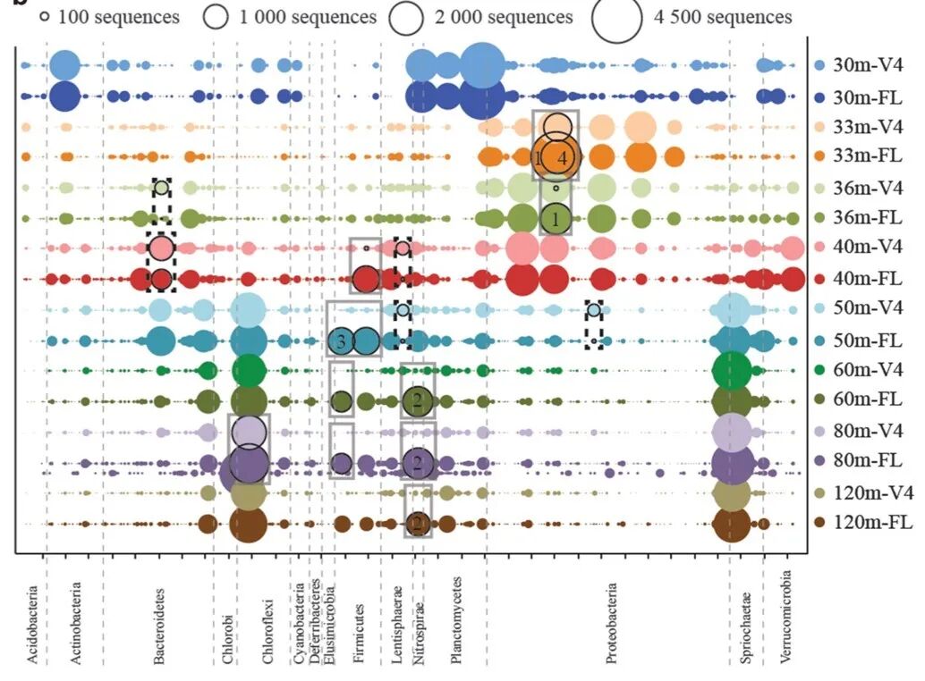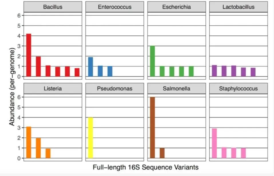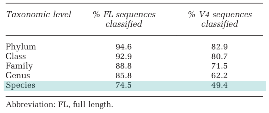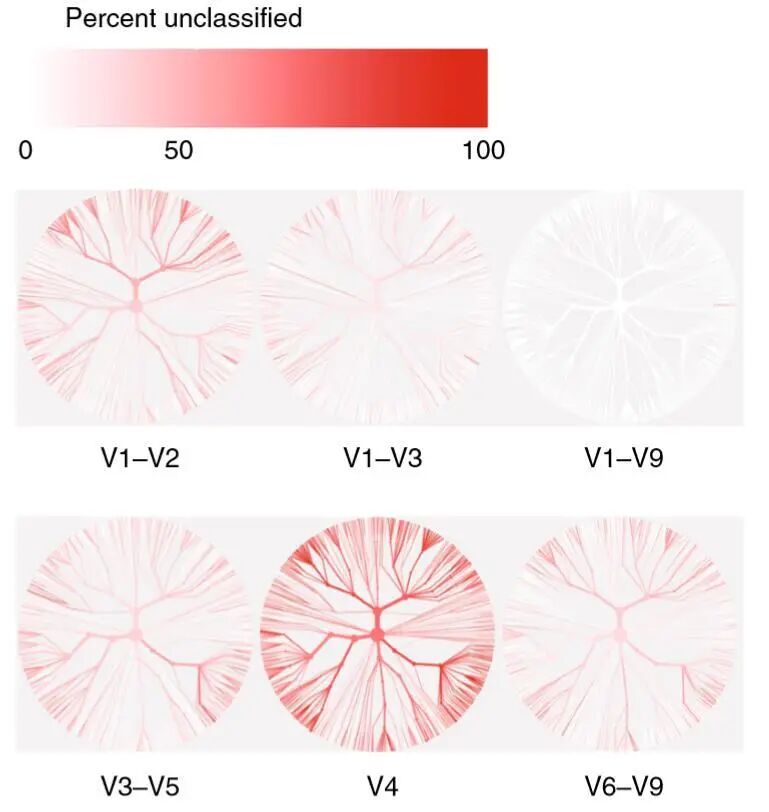 并且每个细菌属中无法通过16S测序在物种水平上进行鉴定的比例会因为可变区域的选择不同而有显著差异。由于人类肠道可以容纳多种多样的细菌演化分支,所以只有全长序列(V1-V9)才能提供所有可能存在的种水平上的无偏差分辨率1。