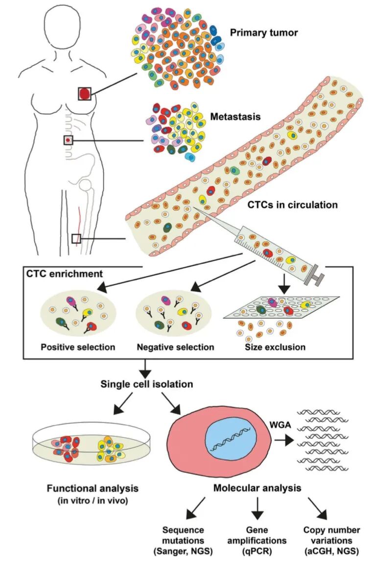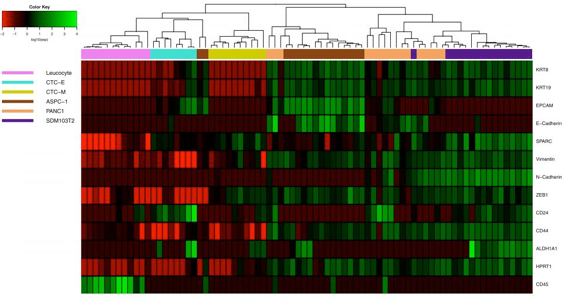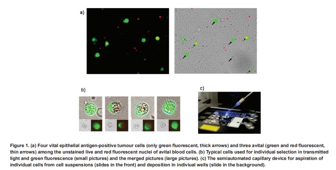 CTC功能和分子水平分析技术路线 应用举例 乳腺癌CTC细胞的挑选 对1mL乳腺癌患者的白细胞,用绿色荧光标记肿瘤细胞标志物EpCAM(膜上皮细胞黏附分子),PI标记死细胞核,利用MMI CellEctor Plus单细胞挑选技术捕获活的循环肿瘤细胞。 乳腺癌CTC细胞表达谱分析 分别对手术前后病人CTC细胞的表达谱进行分析,发现CTC在患者术前术后存在明显的异质性。 胰腺癌CTC挑选 发表于BMC Cancer的这篇文献作者从单细胞转录水平的基因表达分析出发,发现胰腺肿瘤细胞转移和循环肿瘤细胞单细胞转录本表达异质性有关。文中作者从2015年到2017年对21位病人化疗前后多个时间点收集血样作为研究样本。采用Lymphoprep™密度梯度离心法得到单核细胞,采用磁珠阴性筛选的方法去除表达CD45, CD16, CD19, CD163和CD235a/GYPA的淋巴细胞。对可能的CTC细胞进行荧光染色Hoechst 33,342、antibodies EpCAM-FITC、MCAM-FITC 和CD45-DyLight550,利用MMI CellEctor Plus (Molecular Machines & Industries)挑选单个的CTC细胞,进行单细胞RT-qPCR实验对CTC细胞EPCAM、CDH2、CD24等13个基因的转录水平的表达进行分析。 CellEctor 挑选出胰腺癌CTC细胞 对单个胰腺CTC细胞转录水平的基因表达分析确定了不同的亚型,然而在明显同质的癌细胞系中也观察到单细胞之间转录水平的基因表达的异质性。而这些转录本的差异影响CTC细胞的亚型,很可能与胰腺肿瘤细胞的转移相关。 CellEctor系统特点 德国Molecular Machine & Industries (MMI)是专门致力于将显微操作技术与高精度激光技术相结合应用于生命科学领域的一家专业公司,其标志性产品MMI CellCut激光显微切割系统和CellEctor单细胞挑选系统成为目前世界上性能最优异的样本处理系统。基因有限公司作为一家专业性的生命科学仪器、试剂供应商,自1992年成立以来一直秉承着“基因燃亮技术,生物技术改变世界”的宗旨,力求将先进的技术方法推荐到国内,为广大客户提供包括技术咨询、产品选配、售后培训及维护的专业服务体系,并作为MMI全国性代理商,可为感兴趣的客户提供专业的产品咨询、技术答疑及联系试用等,欢迎大家前来咨询。 Lapin et al.Single-cell mRNA profiling reveals transcriptional heterogeneity among pancreatic circulating tumour cells.BMC Cancer (2017) 17:390 M Pizon et al.Heterogeneity of circulating epithelial tumour cells from individual patients with respect to expression profiles and clonal growth (sphere formation) in breast cancer.ecancer 2013, 7:343 Barbara Alberter et al.Single-cell analysis of CTCs with diagnostic precision: opportunities and challenges for personalized medicine.Expert Rev. Mol. Diagn. 16(1), 25–38 (2016) 长按二维码关注我