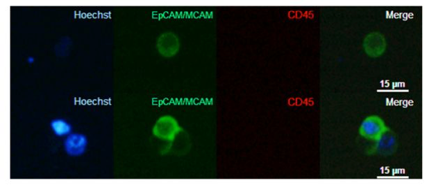 图中可以清晰看到CTC细胞核(Hoechst 33,342)以及肿瘤生物标志物(EpCAM-MCAM)阳性表达和CD45阴性表达。