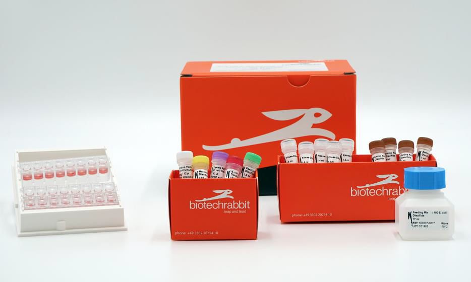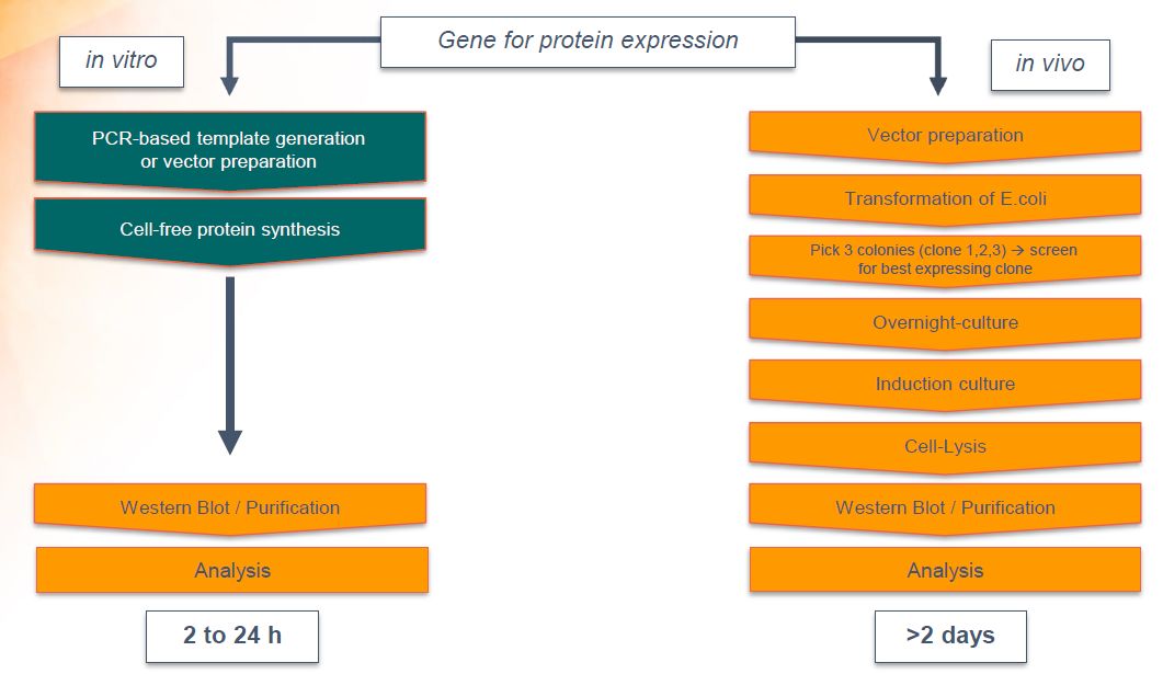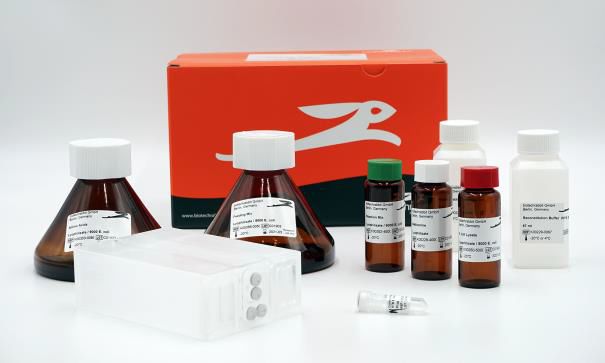 无细胞蛋白合成系统(cell-free protein synthesis system),也叫做体外(in vitro)蛋白表达系统,本系统中包含转录、翻译的全部元件,如T7 RNA聚合酶、核糖体,折叠元件等,加上核酸模板(DNA或者mRNA),无需活细胞即可以进行蛋白合成(图1)。 图1:体外蛋白表达原理图。 无细胞蛋白合成系统优势 1. 特异性好:只有目标蛋白才会被合成,合成产物无需进行复杂的纯化步骤。 2. 不含核酸酶和蛋白酶。 3. 省时间,操作简单: 无需细胞的转化,培养和诱导; 适用于质粒和PCR扩增合成的线状DNA模板; 4. 克服蛋白毒性:即使对宿主细胞有毒性的蛋白也可以顺利合成。 5. 稳定高产:体系中无核酸酶,无蛋白酶,保证了体系的高产和稳定,得率高达50mg。 6. 系统灵活性: 可对合成系统进行个性化调整:自行添加chaperones,去垢剂,修饰酶等其他添加物; 可实现高通量的模板和合成条件的筛选,大大节省时间和精力。 图2:体外和体内蛋白合成方法的实验流程比较。 Biotechrabbit产品技术亮点 来自德国的生产商Biotechrabbit所提供的快速蛋白表达系统(Rapid translation system, RTS),在传统的体外蛋白合成方法基础上进行了升级,通过以下两个关键技术大大改善了体外蛋白合成的效率: 1. 无细胞持续交换系统(Continuous Exchange Cell-Free, CECF) 通过持续补充蛋白合成所需的底物和能量,并不断吸收对蛋白合成反应有抑制作用的副产物,来延长合成反应的持续时间。 图3:CECF技术原理图。 2. 特殊的能量供给方法High yield (HY) biochemistry: 配合优化的缓冲液配方,以糖酵解的方式为持续长时间的合成反应提供稳定足够的能量。 图4:不同方法的体外蛋白合成系统得率对比。红色线为传统产品,蓝色和绿色线分别为Biotech的CECF技术和CECF加HY技术的产品。 RTS产品 目前为止,Biotechrabbit所提供的RTS有三种不同宿主细胞来源的产品,分别是大肠杆菌E. Coli,昆虫细胞和麦芽细胞。常用的E. Coli来源试剂盒以冻干粉形式提供,易于储存和运输。不同大小规格可满足科研用户和工业用户的不同产量需求: 1. RTS E. Coli 100 HY BR1400101, 24 rxn BR1400102, 96 rxn 高通量形式助你快速筛选更合适的质粒和更优表达系统,适合环状和线状DAN模板。 2. RTS 500 E. Coli ProteoMaster HY BR1400201, 5 rxn, 1ml, 6mg 中等规模反应,适合环状DAN模板。 3. RTS 9000 E. Coli HY BR1400301, 1 rxn, 10ml, 50mg 中等规模反应,适合环状DAN模板。 4. 二硫化蛋白合成试剂盒RTS E. Coli Disulfide kits BR1400401, 24 rxn, 50µl BR1400501, 5 rxn, 1 ml 适合需要合成具有空间结构的蛋白质 基因有限公司代理Biotechrabbit的全线试剂耗材产品,包括无细胞蛋白表达产品,冻干粉形式的PCR/qPCR mix,并为全球范围内多家试剂盒生产商提供定制化的酶和蛋白等原材料试剂,有强大的技术支持。请直接回复公众号或联系您身边的基因有限公司获取更多信息!