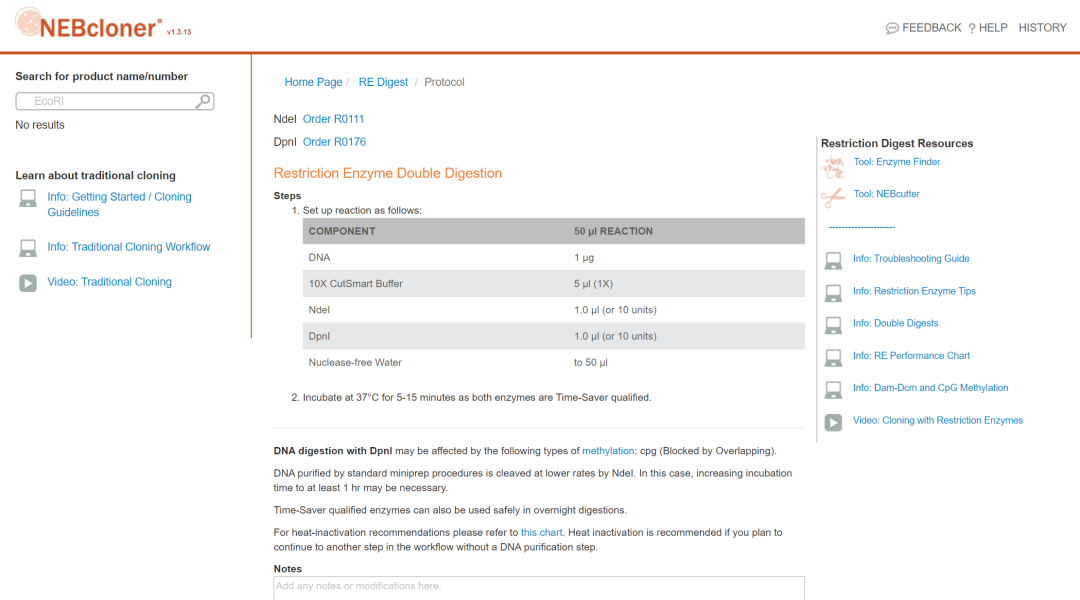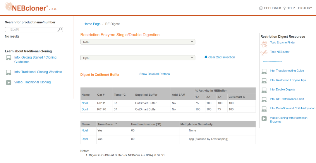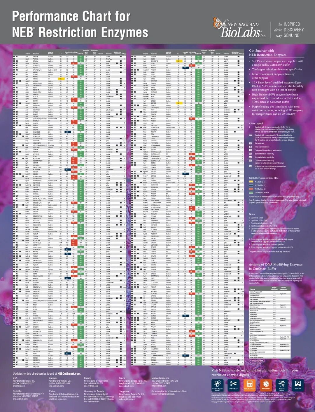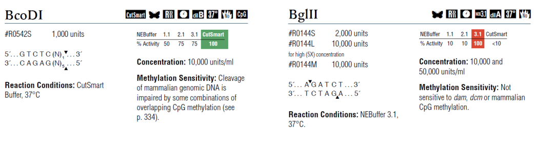 如何找到最适合使用的buffer? 由于绝大多数限制性内切酶在不止一种缓冲液中具有活力,我们需要找到一种缓冲液能让两种限制性内切酶都能有50%以上的活力。由于Cutsmart buffer可以兼容216种限制性内切酶,大多数时候它就是您的最优选择。除此之外,您可以采用以下四种方法: 01 中英文官网 NEB中英文官网的产品介绍中会列出该酶在四种常见缓冲液中的活性,通过对比两种酶的特点,找出最适合的缓冲液。 02 在NEB大目录中查找 NEB大目录中也会列出每一种酶在不同缓冲液中的活性,通过对比找出最适缓冲液。 03 Performance Chart 通过NEB限制性内切酶表现表(Performance Chart for NEB Restriction Enzymes)来查找最适合的缓冲液,该表随NEB大目录赠送给客户。小编当年做实验的时候,总会把这张表贴在冰箱上或者墙上,每次做双酶切前都要“趴墙找”。点击“阅读原文”,即可下载限制性内切酶表现表的电子版。 04 在线工具Double Digest Finder 使用NEB双酶切在线小工具(https://nebcloner.neb.com/#!/redigest),输入或选择您要用的两种酶的名字,即可看到两种酶的特点了。 点击表格上方的“Show Detailed Protocol”,还可以看到详细的实验步骤哦。 两种酶的反应温度不一样怎么办? 首先使用两种酶通用的缓冲液配制反应温度较低的内切酶的反应体系,在其最适温度孵育至反应完毕。再加入第二种酶,在其最适温度孵育。 没有共同缓冲液怎么办? 如果没有一个共同的缓冲液能让两种内切酶的活性均大于50%,则需要进行分步酶切。分步酶切的原则是先切盐浓度低的那种。NEBbuffer的含盐量从低到高依次为:NEBuffer 1.1 < NEBuffer 2.1 < Cutsmart buffer < NEBuffer 3.1。*步酶切完成后,用小体积浓缩盐溶液调整缓冲液中的盐浓度,直至满足第二种酶的要求后,加入第二种酶以完成第二步酶切反应。 也可以在完成*步酶切反应后对底物进行纯化,但会造成一定的底物损失。 未完但是这次不续了 为什么不再继续写了?因为干货满满的官方重磅资料出现啦!从限制性内切酶基本概念,到实验小tips,从常规酶切到琼脂糖内酶切,整整80页,《内切酶实用指南》助您做好酶切反应。请与您身边的基因人联系索取资料,数量有限,先到先得。 基因有限公司自1998年起作为NEB中国区最早的合作伙伴之一,一直为您提供专业的产品咨询和技术支持。 长按二维码,联系小编咨询NEB产品
