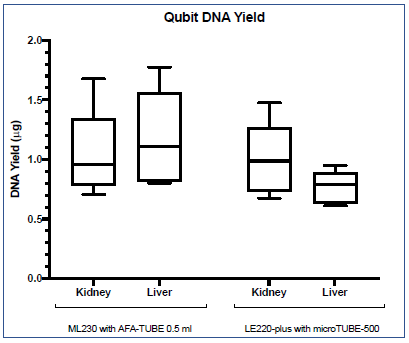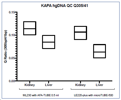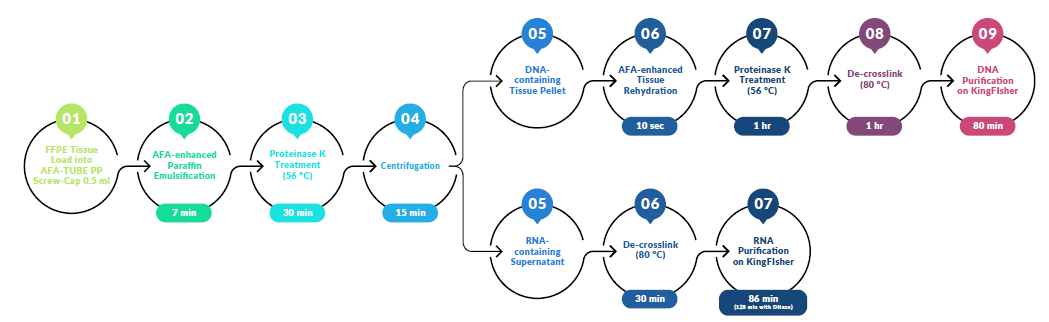 试剂盒升级DNA质量对比 试剂盒升级RNA质量对比 取两组相同肾脏、肝脏来源FFPE样本,每个蜡卷均来自同一蜡块,每组样本做6个重复,左边AFA-TUBE 0.5ml 为升级版ultra kit 提取结果,右边microTUBE-500为旧版kit提取结果。结果显示Covaris FFPE truXTRAC FFPE total ultra kit 升级后在DNA/RNA 得率、完整性等方面均有提升。 Covaris FFPE truXTRAC FFPE total ultra kit 提取DNA/RNA 流程,试剂盒内包含AFA-TUBE PP Screw-Cap 0.5 ml 超声管,超声彻底脱蜡仅需7min! AFA 超声脱蜡更彻底 相信很多人都遇到过提取FFPE核酸样本难脱蜡的情况,有时候要重复脱蜡两遍甚至过夜脱蜡。脱蜡过程中还需要使用二甲苯、矿物油等有机溶剂,有毒且难以彻底脱蜡,稍微厚一点的(>10μm)组织切片更加难以渗透,脱蜡效率就更低了。因为石蜡成了阻碍下一步蛋白酶K消化的屏障,所以组织消化也不够。此外,二甲苯还容易造成核酸降解,本就量少的FFPE样本经过这么一折腾最后的核酸得率质量都受很大影响,也许很多意想不到的基因信息就这么不经意的丢失了。 利用Covaris AFA超声技术来对FFPE样本进行超声乳化脱蜡,想象一下,有聚焦超声的帮助,裂解液和蛋白酶K能够由内而外、由外向内的全方位无死角侵入组织内部脱蜡乳化、组织消化,这样纳米级别的处理当然使得样品脱蜡消化更彻底! 一起来看看Covaris truXTRAC FFPE 核酸提取解决方案的超声脱蜡过程吧,仅需7min,FFPE样本内的白色石蜡颗粒全部溶解出来,你很有必要了解一下!点击下方10秒小视频,简单了解下吧!