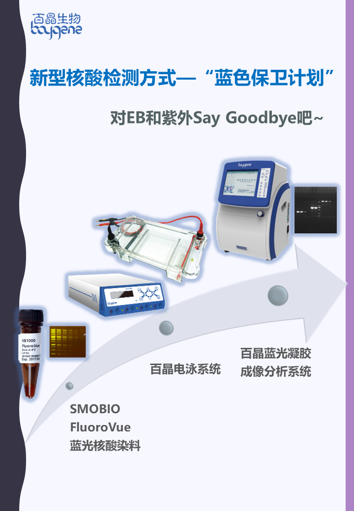 蓝光是一种安全环保光源,越来越多的实验室为了避免EB对人体的伤害,都开始采用安全核酸染料。百晶生物推出的“蓝色保卫计划”——安全的蓝光核酸染料+专业可靠蓝光凝胶成像系统在保证成像质量的同时,为科研人员的安全、实验环境安全、样品安全提供全方位的保护。
