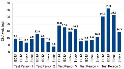cfDNA利用Quantifiler® Human DNA Quantification Kit(Thermo Fisher Scientific®)进行qPCR定量。结果显示无论是不同个体还是不同采血管保存的血浆,均能得到较好的抽提结果。