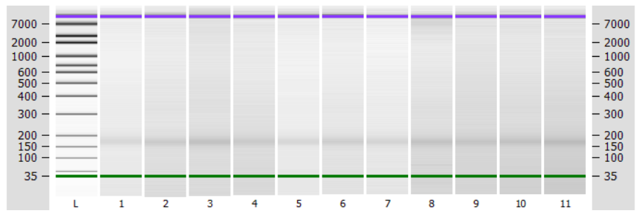 cfDNA利用High Sensitivity DNA 试剂盒在Agilent Bioanalyzer™ 2100平台检测,结果显示cfDNA主要集中在170 bp 范围。